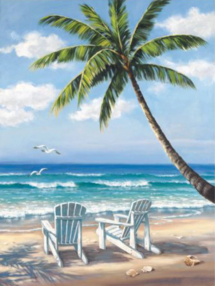 Beach Chair Painting Images. This coastal scene is full of symmetry with adirondack chairs and palm tree on both sides and big, beautiful seascape in the distance. Another lovely beach chair framed photo is beach chairs by christine triebert.